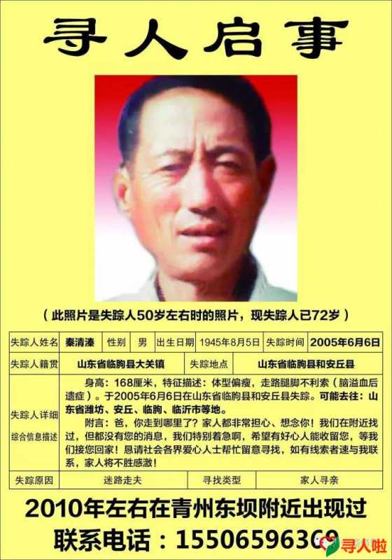 患過腦出血,走路不太利索(腦溢血后遺癥),在臨朐、安丘、昌樂交接的趙家溝村,丁家溝村附近走失,尋找多年,沒有音信