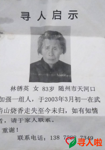 2003年3月初1在武當山燒香拜佛與家人走散;之后一起尋找至今無音信;去武當山之前幾天在家與家人因家庭瑣事有吵架;當時有講氣話說以后在也不回來了;大約一周后與家人一起去武當山上香(每年都去)家人也沒在意;就走散了!注:因信佛忌葷菜;在寺廟可能性較大!隨州市天河口鄉(xiāng)人!