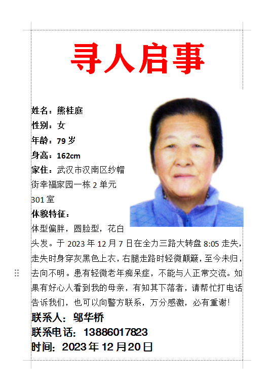 母親(熊桂庭)離家出走。方向往江夏。公交車到開發區。失去方向感。年齡過大。有點神志不清。以上圖片。是出走時穿著。頭發花白。以前染發過。右腳風濕。走路時不便。有高血壓。望有心人見到。立即報警。